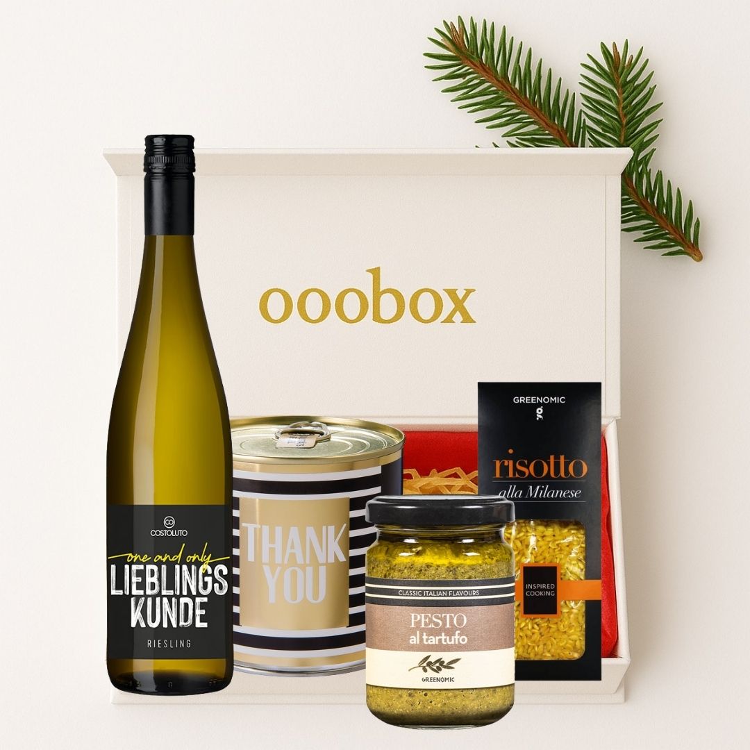 Ausserdem bieten wir natürlich auch reichlich Platz für deine eigene Kreativität. Mit der Kategorie "Selber zusammenstellen" kannst du dir deine ganz eigene My-ooobox ganz nach Lust, Laune, Anlass und Budget Schritt für Schritt zusammenstellen. So suchst Du zunächst die Produkte aus, die dir gefallen. Hier kannst Du von exzellenten Delikatessen (Champagner, Öle, Gewürze etc.) über ausgefallenen Seifen und Servietten bis hin zum passenden Luftballon alles für deine perfekte Geschenkbox zusammenstellen. Im nächsten Schritt suchst du die passende Geschenkbox zum Thema aus.