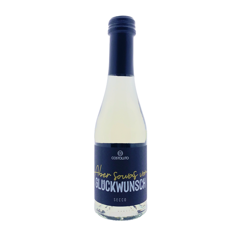 Der Piccolo-Secco „Aber sowas von Glückwunsch“ ist die ideale Wahl, um besondere Anlässe gebührend zu feiern. Seine spritzige Note und die handliche Flaschengröße machen ihn perfekt zum Anstoßen bei Geburtstagen, Jubiläen oder anderen freudigen Ereignissen. Erleben Sie einen prickelnden Genuss, der jede Gratulation unvergesslich macht. Dieses erfrischende Geschenk sorgt für Freude und festliche Stimmung. Hochwertiger Prosecco von Costoluto im praktischen 200-ml-Format.